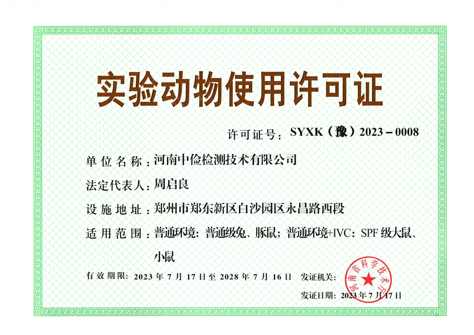 2023年07月17日,河南省科技廳核準我公司實驗動物使用許可證更換新證,編號為SYXK(豫)2023-0008.有效期5年。